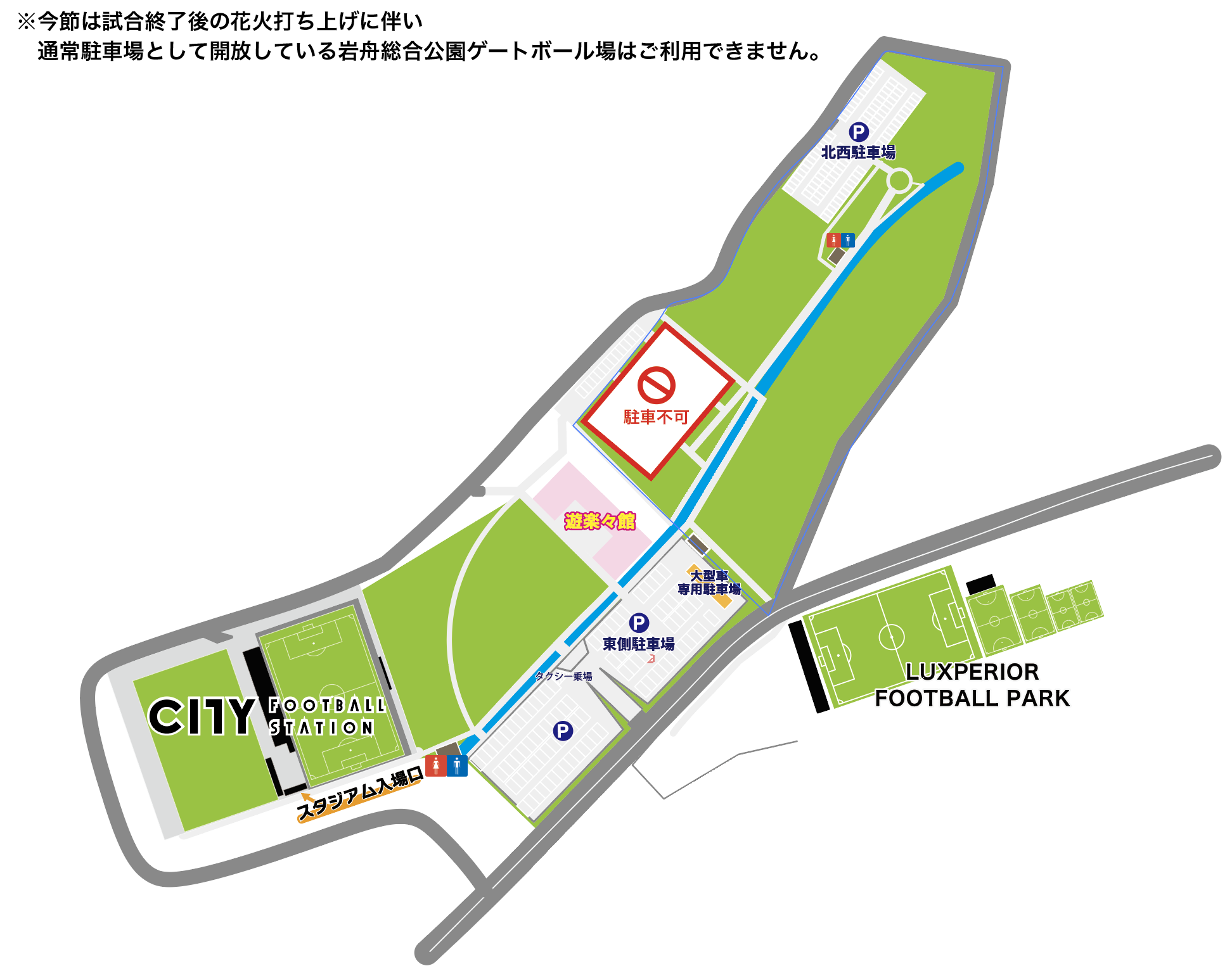 ※LUXPERIOR FOOTBALL PARK駐車場から遊楽々館の駐車場まで車道を歩いての通行は大変危険ですので、上記の地図の道を通りCFSの方へお越しください。