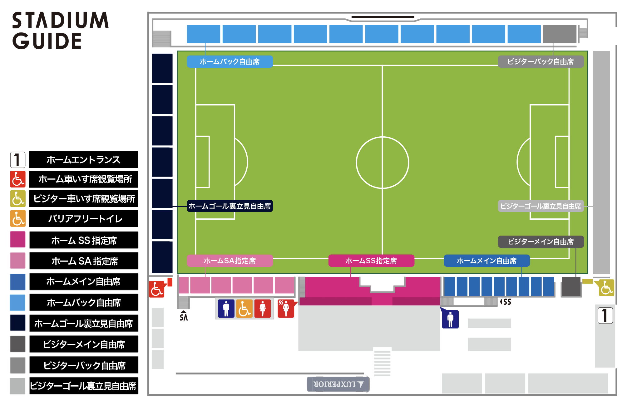※「ホームメイン立見自由席」「ホームゴール裏立見自由席」「ビジターメイン立見自由席」「ビジターゴール裏立見自由席」は立ち見席となります。