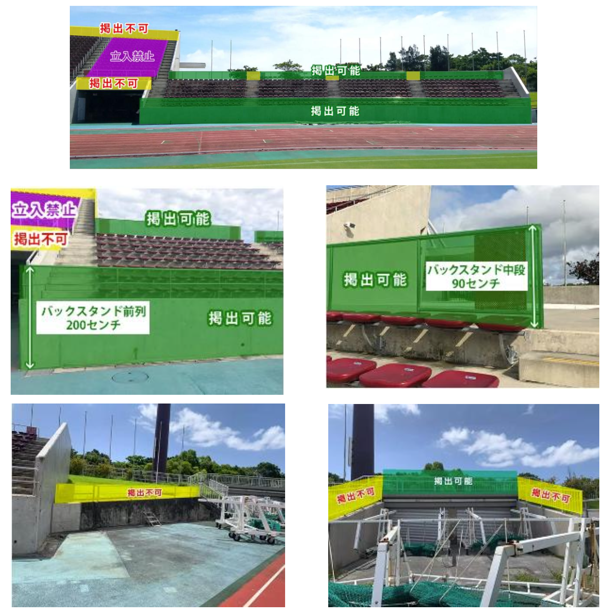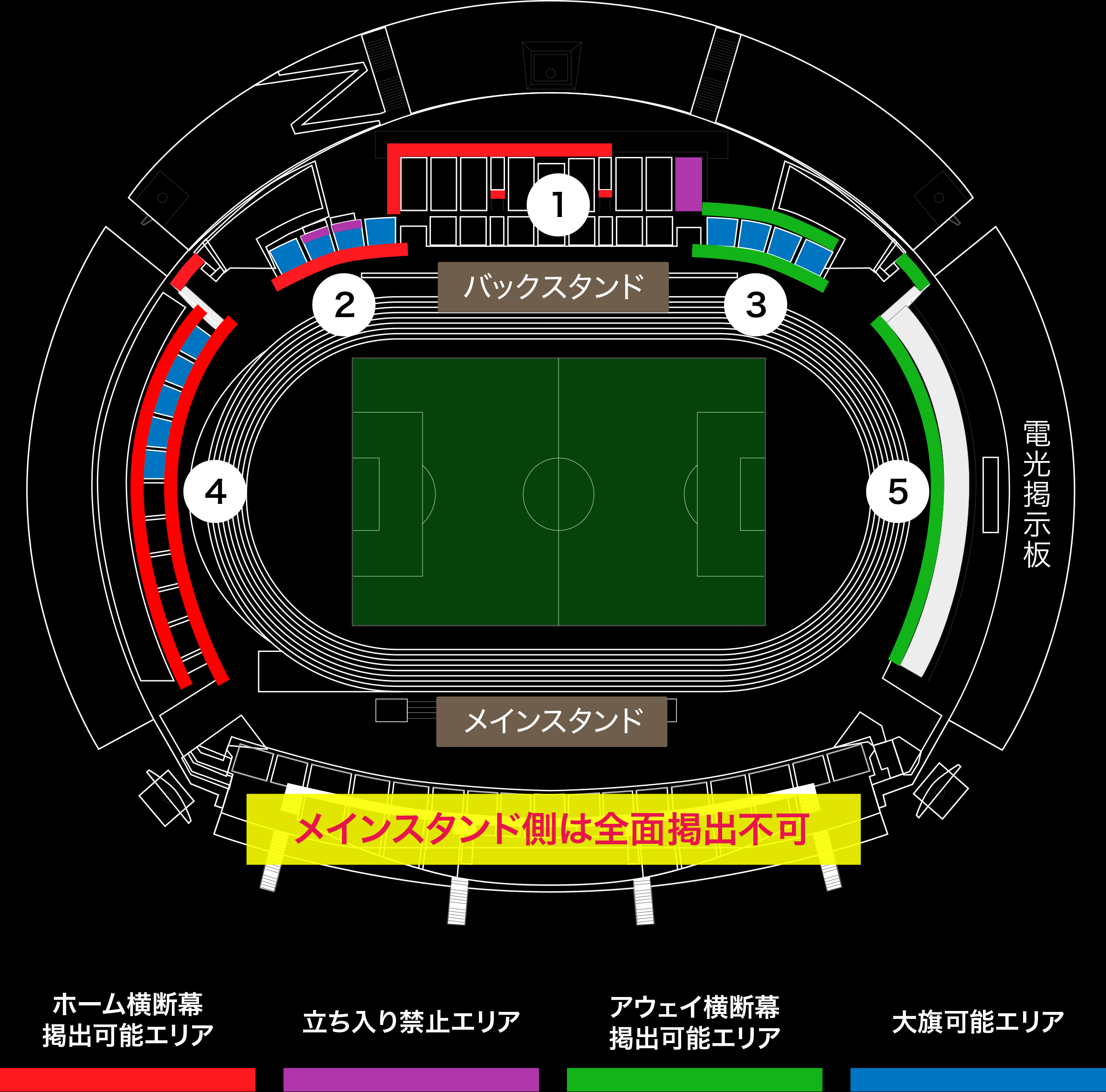 下図③のバックスタンドアウェイ側エリアでのみ使用可能です。
