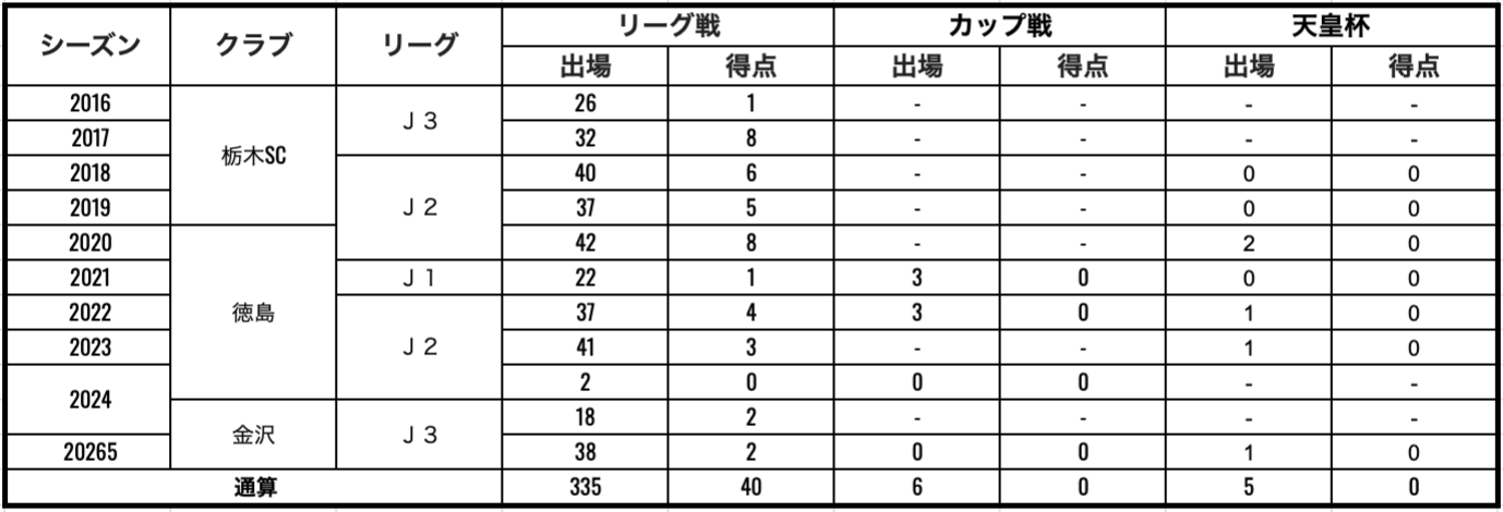 益子SCストラーダ – JEF宇都宮 – 鹿島学園高校 – 流通経済大学 – 栃木SC – 徳島ヴォルティス – ツエーゲン金沢