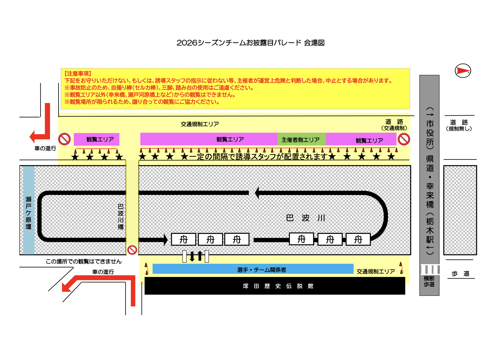 下記をお守りいただけない場合、もしくは誘導スタッフの指示に従わない等、主催者が運営上危険と判断した場合、中止とする場合があります。