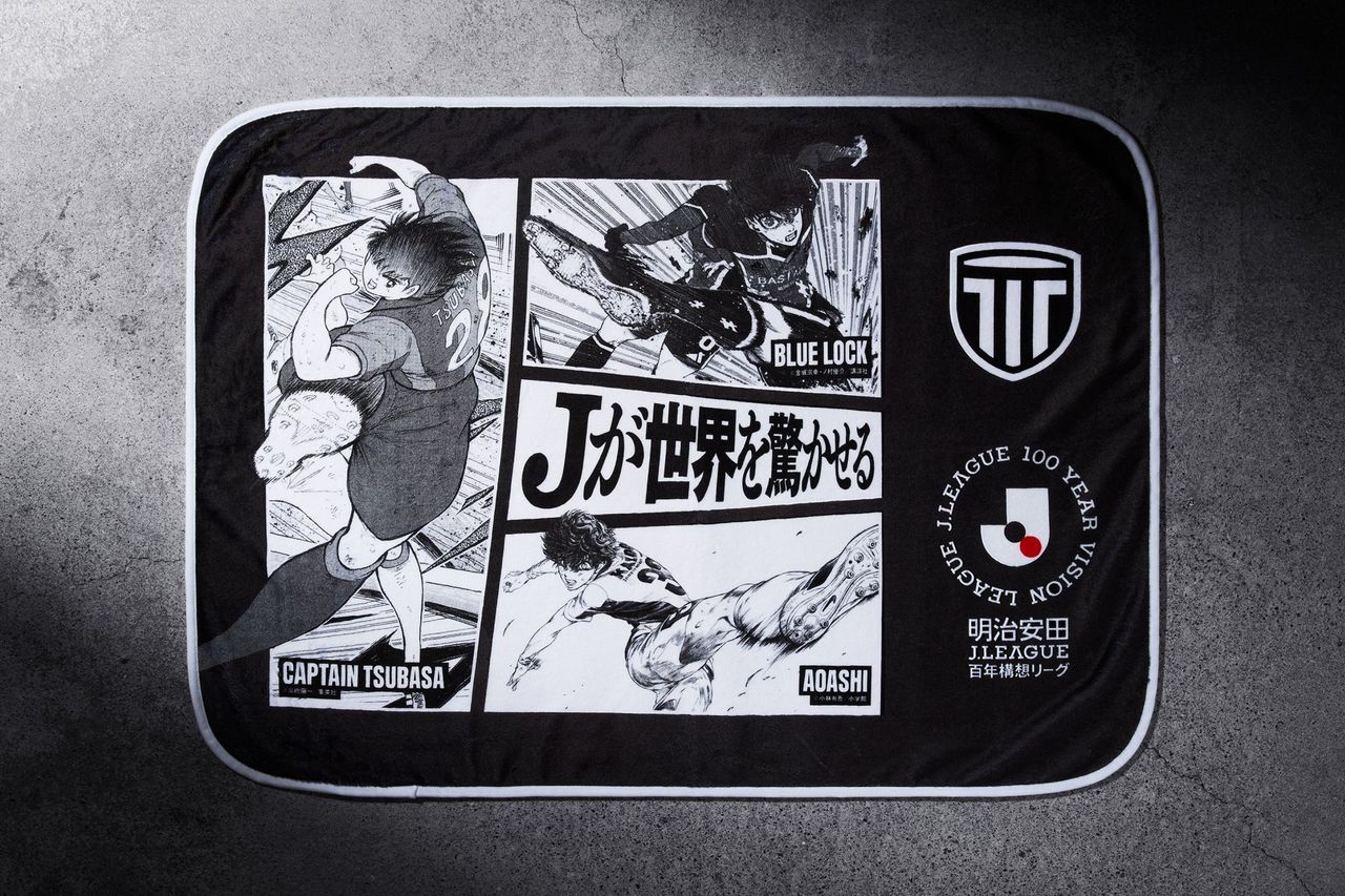 ブランケットのデザインには、日本が世界に誇るサッカー漫画「キャプテン翼」をはじめ、近年国内外で絶大な人気を誇る「ブルーロック」「アオアシ」の3つの作品との史上初のトリプルコラボレーションが実現しました。シーズン移行という大きな転換点を経て、Jリーグが今後さらに結果を出し、世界を驚かせるという意思を、3作品の主人公が放つ力強いシュートと重ね合わせ、メッセージとして発信していきます。