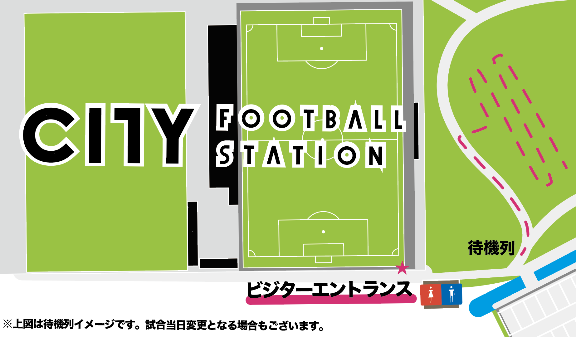 ・CITY FOOTBALL STATIONは、ピッチと観客席の距離が近いため、飛んでくるボールにはご注意ください。なお、ピッチ内アップ終了後までゴール裏に防球ネットを設置しております。ピッチ内アップ後、防球ネットは撤収いたします。
