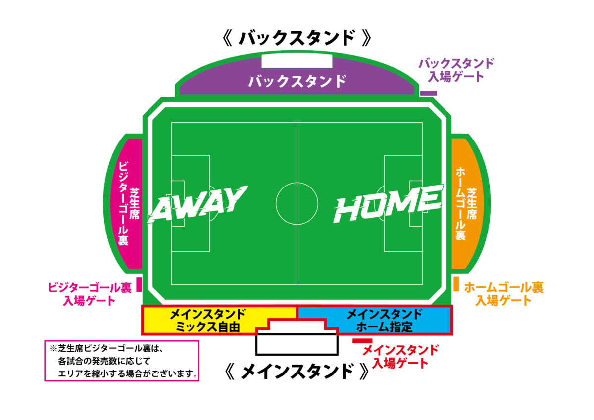 (※「芝生席ホームゴール裏」「芝生席ビジターゴール裏」は熱狂応援エリアとなりますので、来場状況により敷物を敷いての観戦などをご遠慮いただく場合がございます。予めご了承ください。 )
