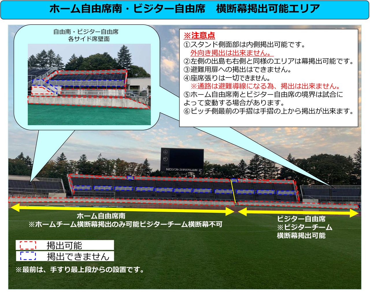 ホーム自由席、ビジター自由席の最前列以外での大旗の使用を禁止しています。
