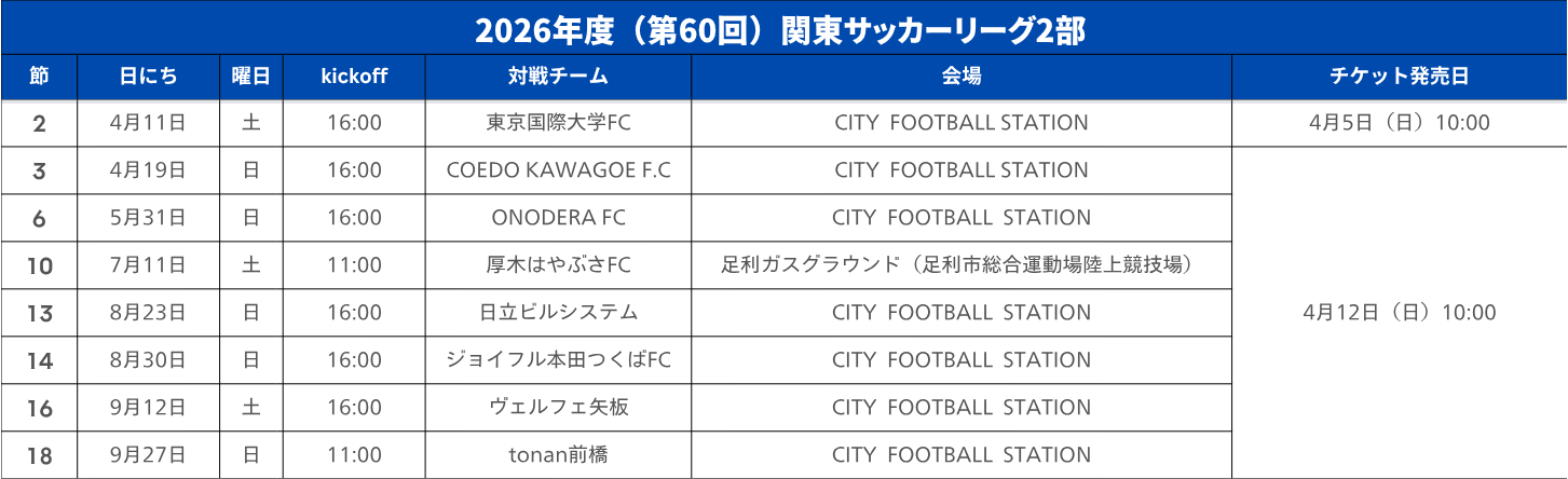 関東サッカーリーグ2部のホームゲームチケット販売概要が決定しましたので、お知らせいたします。
